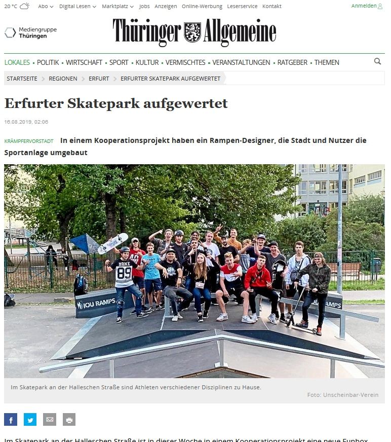 Der Skatepark Hallische Straße in Erfurt soll ende Juli seine Funbox Ersatz erhalten. Es könnte sein das ein RollerCoaster dazu Betrug das die Box noch nicht steht. Durch Recherchen konnte herausgefunden werden das der Rampenbauer in München gesichtet wurde. http://www.iou-ramps.com/.